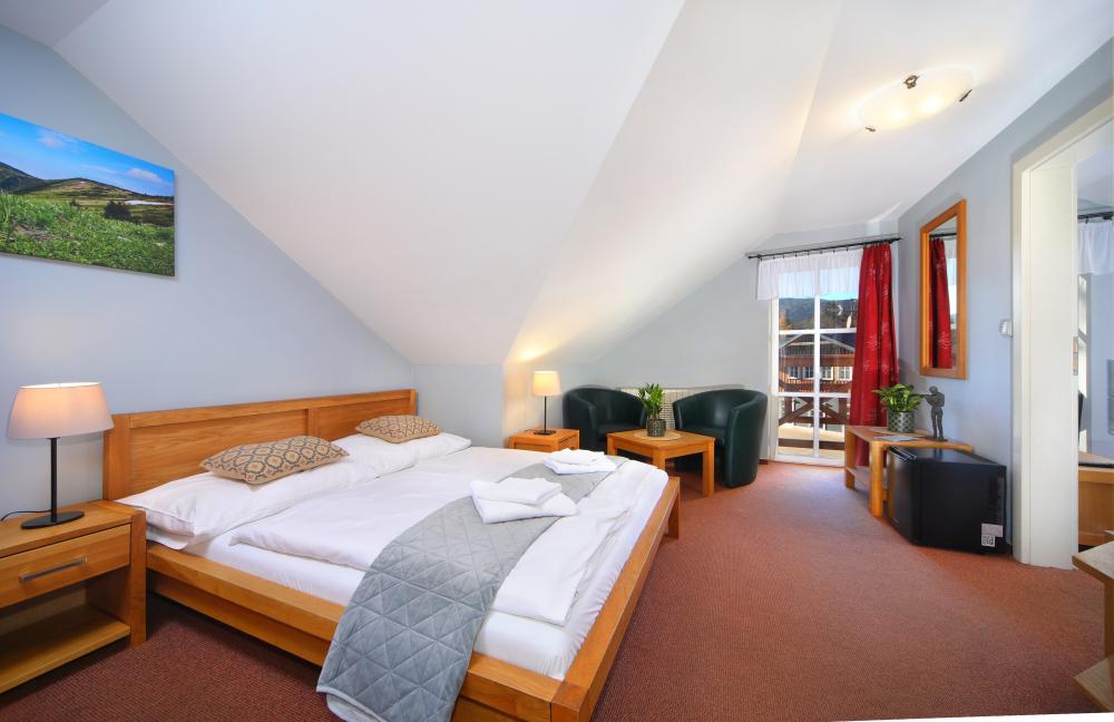 Apartmán pro 2 + 2 osoby 40m2: Sháníte pohodlné ubytování v centru Špindlerova Mlýna pro celou rodinu? Plánujete navštívit zábavné atrakce ve městě a všude dojít pěšky? Vsaďte na plně vybavené apartmá pro 2+2 osoby v hotelu Erika. Čeká na vás komfortní pokoj s jednou manželskou postelí a jednou jednolůžkovou postelí, malou lednicí, druhý pokoj s rozkládacím gaučem , televize